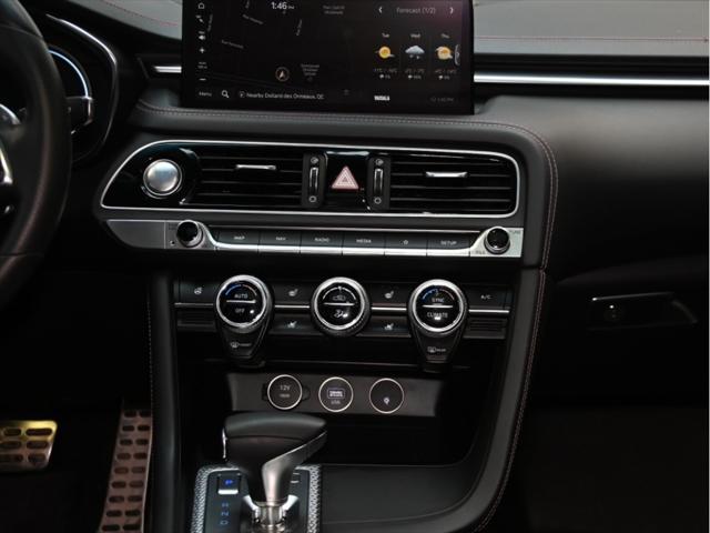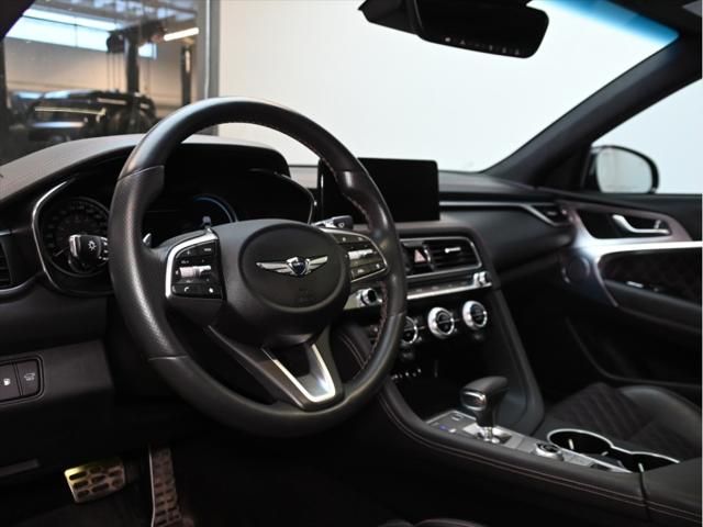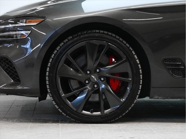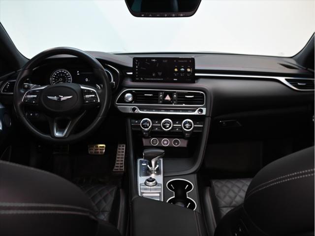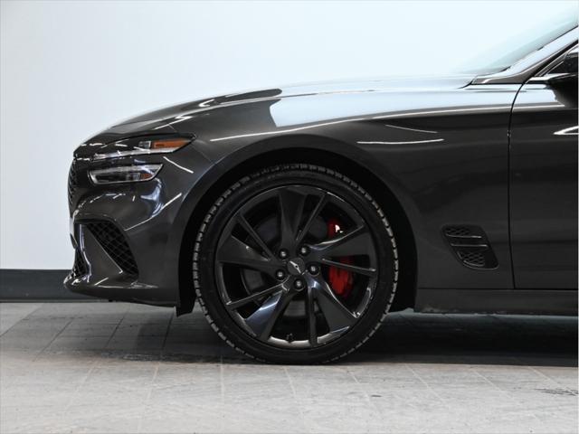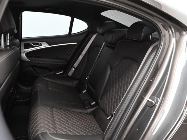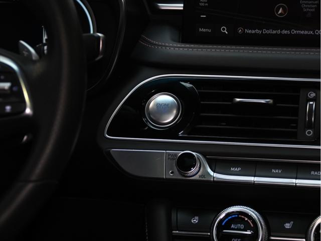 Groupe motopropulseur et performance Moteur V6 biturbo de 3 3 L 365 chevaux à 6 000 tr/min Couple de 376 lb-pi entre 1 300 et 4 500 tr/min Boîte automatique à 8 rapports Traction intégrale (AWD) Contrôle de lancement Sélecteur de modes de conduite (Éco Confort Sport Sport+) Différentiel à glissement limité (Sport) Consommation de carburant (estimée – Canada) Ville : env. 13 0 L/100 km Route : env. 9 8 L/100 km Combinée : env. 11 6 L/100 km Carburant recommandé : super (91 octane) Caractéristiques extérieures Jantes sport en alliage de 19 po Freins haute performance Brembo Suspension sport calibrée Phares et feux arrière à DEL Rétroviseurs extérieurs chauffants et rabattables électriquement Garnitures extérieures en chrome foncé Quadruple sortie déchappement Coffre intelligent mains libres Habitacle et confort Sièges en cuir Nappa Sièges avant chauffants et ventilés Sièges arrière chauffants Siège conducteur électrique à 12 réglages avec mémoire Volant sport gainé de cuir Garnitures intérieures en aluminium Climatisation automatique bizone Volant inclinable et télescopique à réglage électrique Technologie et multimédia Écran tactile de 10 25 po Services connectés Genesis Apple CarPlay et Android Auto™ Système de navigation Recharge sans fil pour téléphone intelligent Affichage tête haute Système audio Lexicon haut de gamme (15 haut-parleurs) Sécurité et aides à la conduite Assistance à lévitement de collision frontale Assistance à lévitement de collision dans les angles morts Assistance au maintien et au suivi de voie Régulateur de vitesse adaptatif avec arrêt et redémarrage Assistance à lévitement de collision transversale arrière Alerte de vigilance du conducteur Caméra panoramique à 360° Avertisseur de distance de stationnement avant et arrière