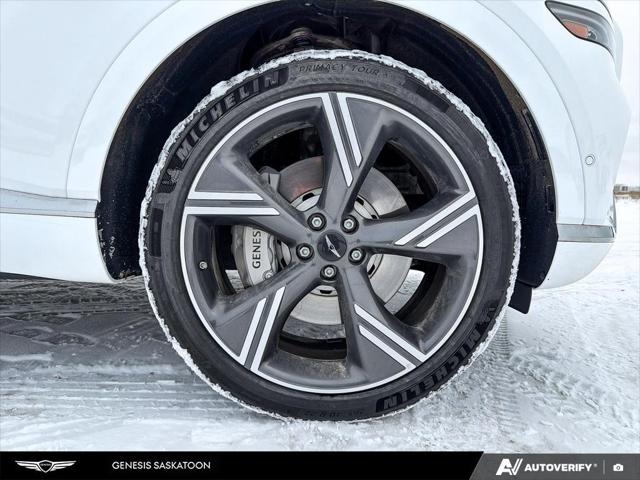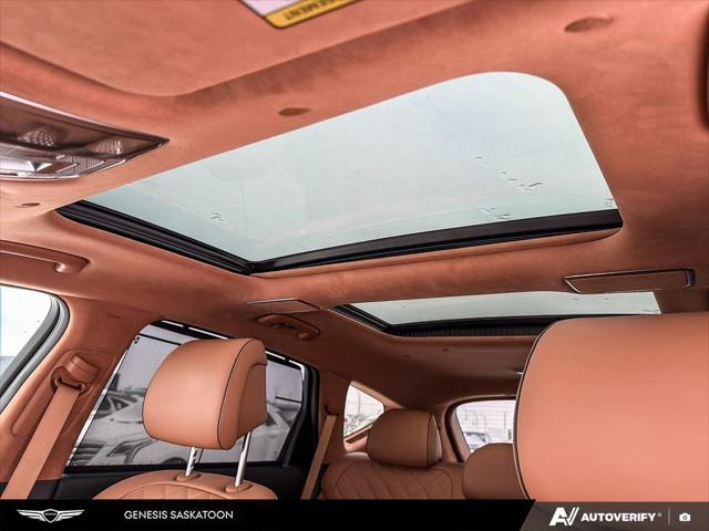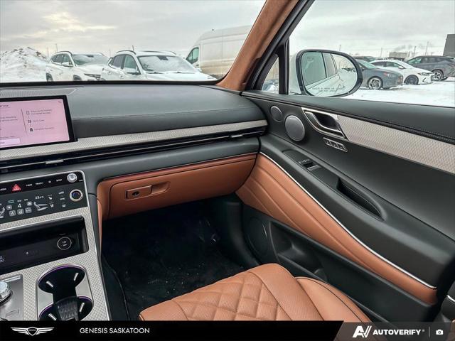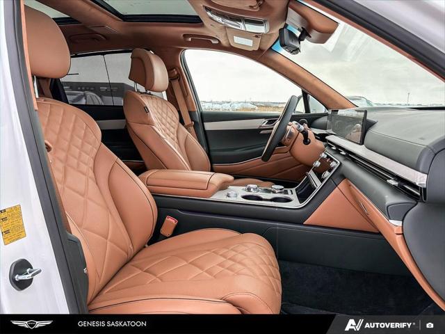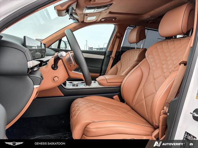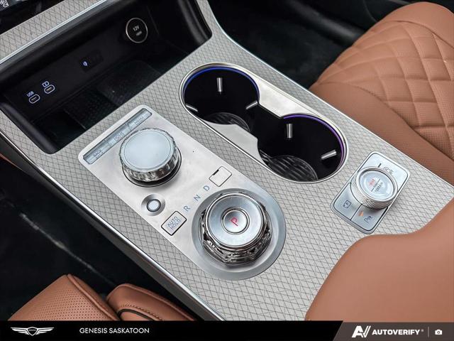 Our GV80's trim level is 3.5T Prestige AWD 7P. The interior delivers exceptional luxury and versatility with leather seating surfaces across three rows including power-folding third-row seats and 12-way adjustable heated and ventilated front seats with lumbar support and a smart posture care system. A heated leather steering wheel genuine wood trim and ambient lighting create a refined atmosphere while the integrated 27-inch OLED display provides seamless access to navigation connected services and entertainment through a Bang & Olufsen 18-speaker audio system. Every passenger enjoys tailored comfort with multi-zone climate control rear sunblinds and ample space enhanced by meticulous craftsmanship. Advanced safety technologies like Highway Driving Assist II Blind-Spot Collision-Avoidance and an Aerial View Camera System combine with automatic remote parking and collision mitigation features to ensure confidence on every journey.