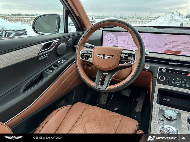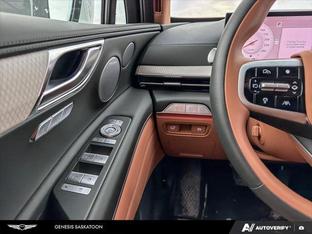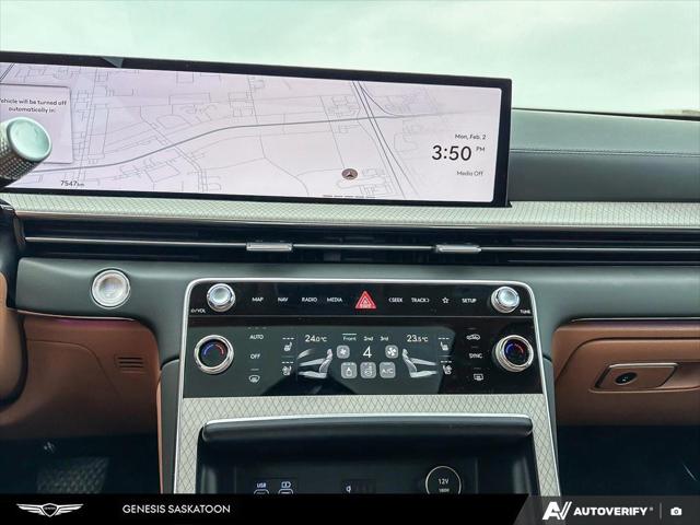 Our GV80's trim level is 3.5T Prestige AWD 7P. The interior delivers exceptional luxury and versatility with leather seating surfaces across three rows including power-folding third-row seats and 12-way adjustable heated and ventilated front seats with lumbar support and a smart posture care system. A heated leather steering wheel genuine wood trim and ambient lighting create a refined atmosphere while the integrated 27-inch OLED display provides seamless access to navigation connected services and entertainment through a Bang & Olufsen 18-speaker audio system. Every passenger enjoys tailored comfort with multi-zone climate control rear sunblinds and ample space enhanced by meticulous craftsmanship. Advanced safety technologies like Highway Driving Assist II Blind-Spot Collision-Avoidance and an Aerial View Camera System combine with automatic remote parking and collision mitigation features to ensure confidence on every journey.