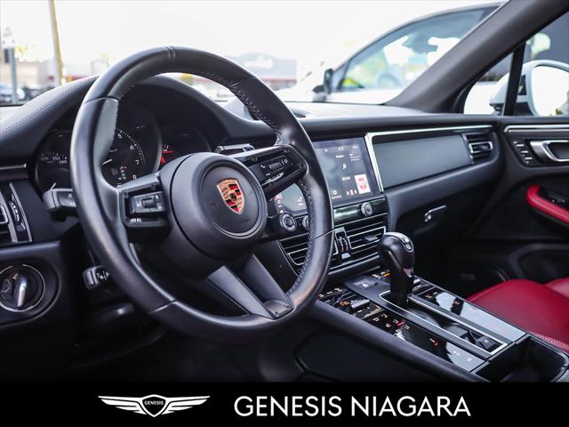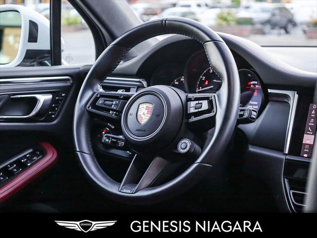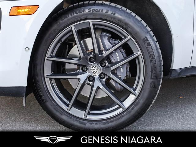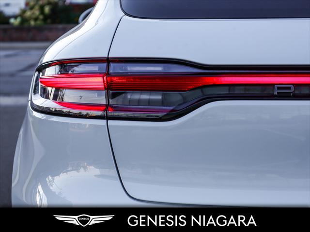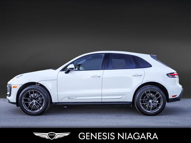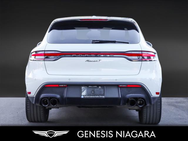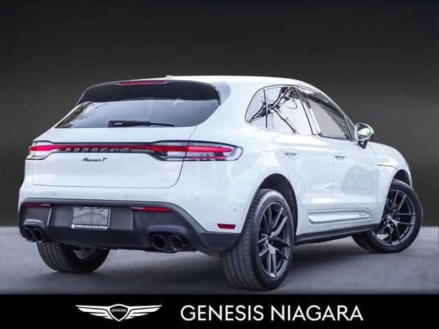 The 2023 Porsche Macan T is a driver-focused lighter and more agile version of the base Macan featuring a 2.0L turbocharged four-cylinder engine producing 261 hp and 295 lb-ft of torque a 7-speed PDK transmission and a sportier chassis setup with standard all-wheel drive. Key distinguishing features include specific Agate Grey Metallic exterior trim dark titanium 20-inch wheels and enhanced interior elements like the Sport Chrono Package. It was the first SUV to receive the ''T'' designation signifying its ''Touring'' purpose of providing an authentic dynamic driving experience. Agility Focus: The Macan T prioritizes driving dynamics and agility over raw power making it the lightest Macan variant. Dynamic Tuning: It features a precise and dynamic chassis setup including standard Porsche Active Suspension Management (PASM) which lowers the ride height by 15 mm. Sport Chrono Package: This package is standard providing enhanced control and driving modes like Sport Response which offers a 20-second power boost. Exclusive Design: Unique design cues include Agate Grey Metallic exterior accents on the front rear and side blades along with dark titanium 20-inch Macan wheels. Interior Accents: The cabin includes a heated GT Sport steering wheel a black aluminum Macan T kick plate and deeply bolstered sport seats.