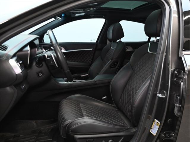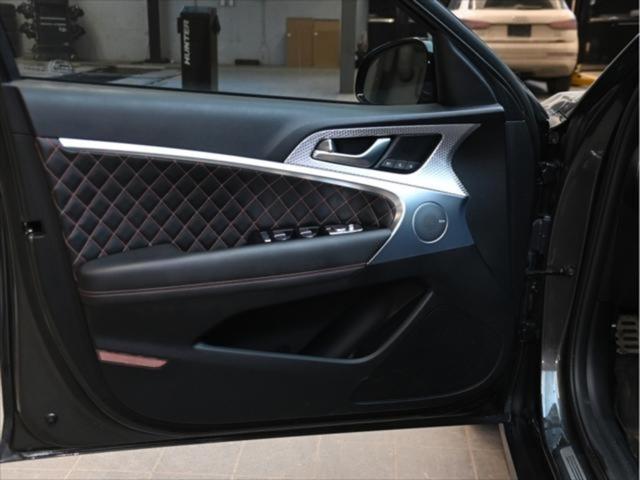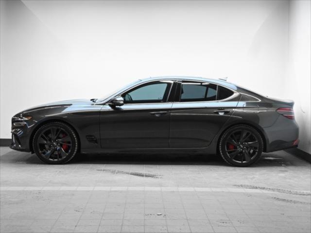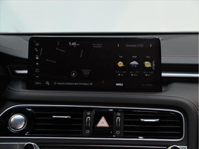 Groupe motopropulseur et performance Moteur V6 biturbo de 3 3 L 365 chevaux à 6 000 tr/min Couple de 376 lb-pi entre 1 300 et 4 500 tr/min Boîte automatique à 8 rapports Traction intégrale (AWD) Contrôle de lancement Sélecteur de modes de conduite (Éco Confort Sport Sport+) Différentiel à glissement limité (Sport) Consommation de carburant (estimée – Canada) Ville : env. 13 0 L/100 km Route : env. 9 8 L/100 km Combinée : env. 11 6 L/100 km Carburant recommandé : super (91 octane) Caractéristiques extérieures Jantes sport en alliage de 19 po Freins haute performance Brembo Suspension sport calibrée Phares et feux arrière à DEL Rétroviseurs extérieurs chauffants et rabattables électriquement Garnitures extérieures en chrome foncé Quadruple sortie déchappement Coffre intelligent mains libres Habitacle et confort Sièges en cuir Nappa Sièges avant chauffants et ventilés Sièges arrière chauffants Siège conducteur électrique à 12 réglages avec mémoire Volant sport gainé de cuir Garnitures intérieures en aluminium Climatisation automatique bizone Volant inclinable et télescopique à réglage électrique Technologie et multimédia Écran tactile de 10 25 po Services connectés Genesis Apple CarPlay et Android Auto™ Système de navigation Recharge sans fil pour téléphone intelligent Affichage tête haute Système audio Lexicon haut de gamme (15 haut-parleurs) Sécurité et aides à la conduite Assistance à lévitement de collision frontale Assistance à lévitement de collision dans les angles morts Assistance au maintien et au suivi de voie Régulateur de vitesse adaptatif avec arrêt et redémarrage Assistance à lévitement de collision transversale arrière Alerte de vigilance du conducteur Caméra panoramique à 360° Avertisseur de distance de stationnement avant et arrière