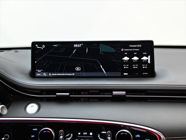Groupe motopropulseur Deux moteurs électriques (traction intégrale) 429 ch (320 kW) Mode Boost : 483 ch pendant 10 secondes 516 lb-pi de couple Batterie lithium-ion de 77 4 kWh Traction intégrale électronique (e-AWD) Transmission à rapport unique Recharge Capacité de recharge rapide jusquà 350 kW Recharge de 10 % à 80 % en environ 18 minutes (borne rapide) Recharge résidentielle niveau 2 (240 V) Fonction Vehicle-to-Load (V2L) pour alimenter des appareils externes Autonomie Autonomie estimée : environ 383 km (RNCan) Performance / Conduite Suspension à contrôle électronique avec lecture de la route Sélecteur de modes de conduite Mode e-Terrain (Neige / Boue / Sable) Freinage régénératif avec palettes au volant Mode de conduite i-Pedal Contrôle actif du bruit de la route (ANC-R) Extérieur Jantes en alliage de 20 pouces Phares DEL complets avec feux de route automatiques Signature lumineuse Genesis à deux lignes Hayon électrique intelligent mains libres Toit ouvrant panoramique Miroirs extérieurs chauffants rabattables électriquement Port de recharge intégré à la calandre Vitres acoustiques laminées Intérieur Sièges en cuir Nappa Sièges avant et arrière chauffants Sièges avant ventilés Sièges conducteur et passager électriques avec mémoire Volant chauffant Éclairage dambiance intérieur Volant télescopique et inclinable électrique Garnitures intérieures en aluminium Technologie Écran tactile de 14 5 pouces avec navigation Services connectés Genesis Apple CarPlay et Android Auto Tableau de bord numérique 12 3 pouces (3D) Affichage tête haute (HUD) Recharge sans fil pour téléphone Système audio Lexicon haut de gamme (15 haut-parleurs) Sécurité et aides à la conduite Assistance anticollision frontale Assistance anticollision dans langle mort Moniteur dangle mort avec caméra Assistance au maintien de voie Assistance de suivi de voie Assistance à la conduite sur autoroute II Régulateur de vitesse intelligent avec arrêt/redémarrage Caméra panoramique 360° Assistance au stationnement intelligent à distance Assistance de sortie sécuritaire Assistance anticollision trafic transversal arrière Fonctions supplémentaires Clé numérique Genesis Système dauthentification par empreinte digitale Mises à jour logicielles à distance (OTA) Démarrage à distance avec contrôle de la climatisation